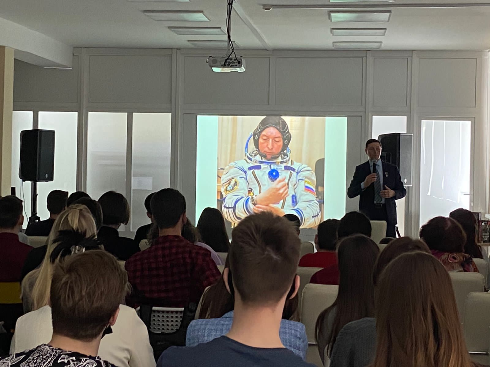 Сергей Ревин рассказал о старте своей карьеры, представил презентацию с рассказом о подготовке космонавтов. Затем спикер рассказал, чем занимаются космонавты на орбите и как проходит адаптация после возвращения на Землю.