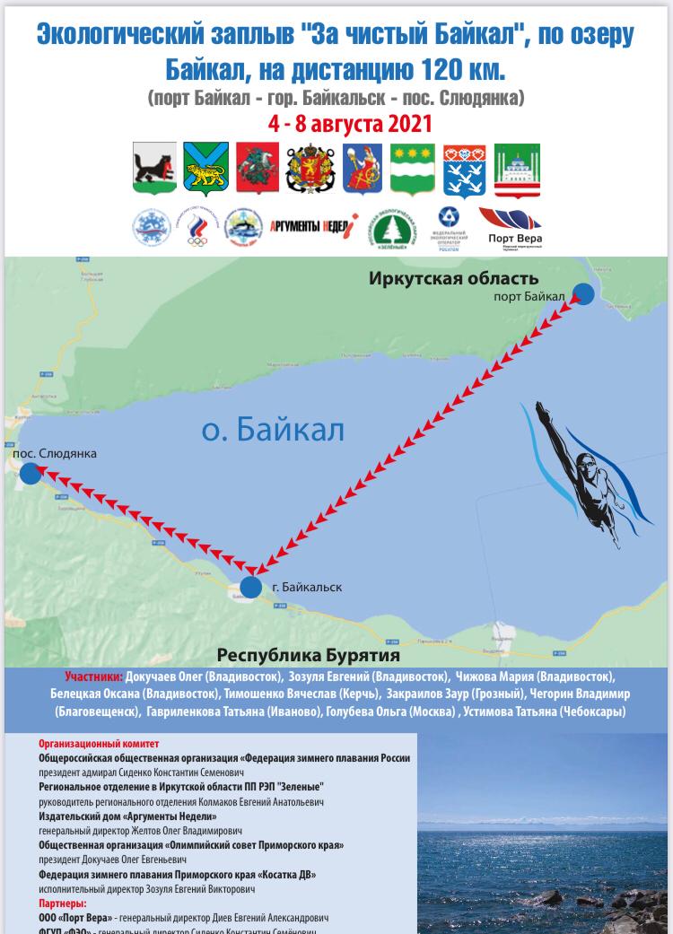 С 5 по 7 августа 2021 состоится экологический заплыв «За чистый Байкал» на дистанцию до 120 км по маршруту «порт Байкал – город Байкальск – город Слюдянка».